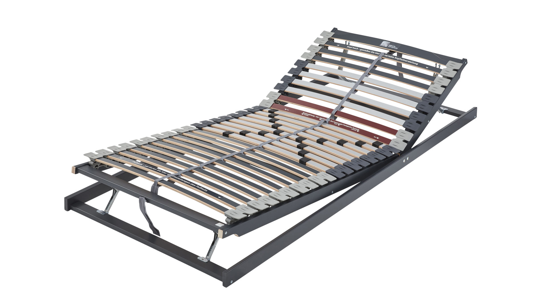Die verstärkte Beckenzone lässt sich über Schiebeelemente individuell auf deine Körpermitte abstimmen. So bestimmst du selbst, wie fest oder weich der Lattenrost in diesem Bereich reagiert – ideal für eine ergonomisch korrekte Schlafhaltung und eine gezielte Entlastung der Wirbelsäule.
